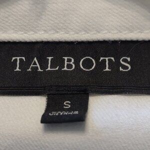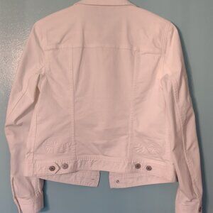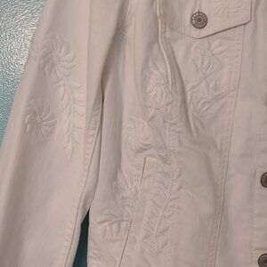 Talbots white jean jacket, size S. NOTE: the picture looks pink, but this is a white jacket. Intricate floral fashion embroidery on front and lower back. 6 buttons down front; 2 button-down pockets and 2 side pockets. 89% cotton, 8% polyester, 3% spandex. Machine wash cold, tumble dry low. Made in Vietnam. Approximate measurements: neckline to hem - 19"; sleeves - 23"; armpit to armpit - 17". Like-new condition.