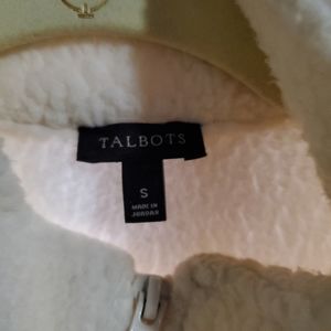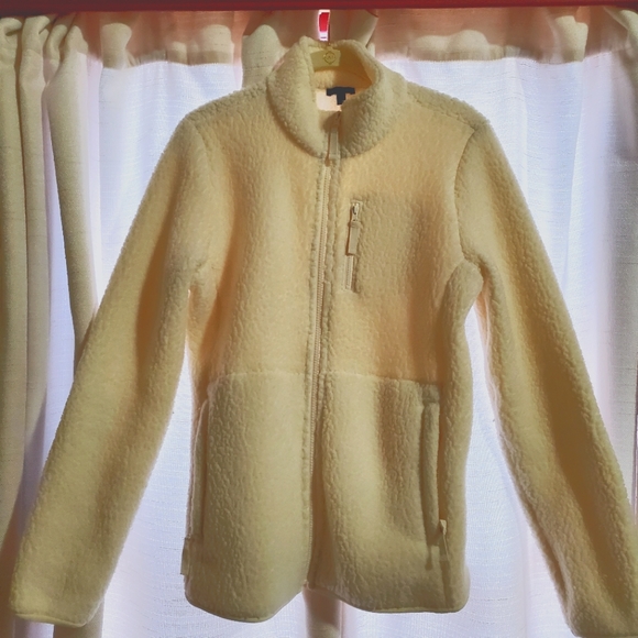 Winter white/cream colored fleece jacket. Size small. Zipper front pockets. Jacket length 25". Sleave length 25". Pit to pit- 19". No rips, tears, or stains. The pictures make it look more yellow, but it's not.