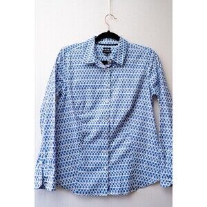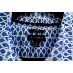 The Talbots women's 6-button down career blouse is a versatile and stylish addition to any office or casual outfit. Made from non-iron cotton material, this blouse features a geometric pattern in a classic blue color. With a collared neckline, button closure, and long sleeves, this blouse offers a regular fit that is perfect for both business and casual occasions. The Talbots brand is known for its quality and this blouse is no exception, making it a wardrobe staple for the modern woman.