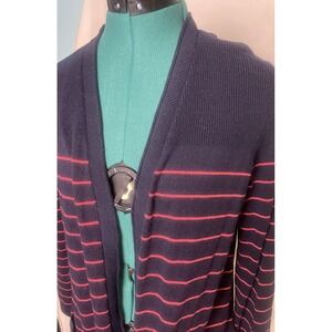 Talbots women's navy and pink striped long open front cardigan with pockets size petite medium. 55% cotton blend. Very soft as is made with 5% cashmere. Preowned good condition.