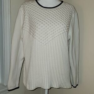 Talbots womens white cable bobble knit 3D sweater Sz XL navy trim 100% cotton