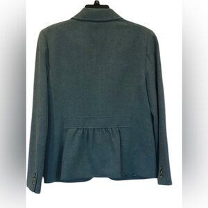 Beautiful blue/green color wool blazer. Fully lined with gather detail on backside. Excellent condition.