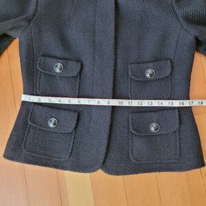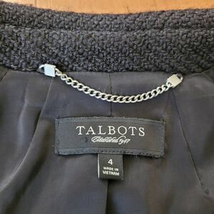 Talbots wool blend black chanel inspired blazer size 4 long sleeved collared twill. In excellent pre owned condition with no signs of wear or damage as shown in photos.