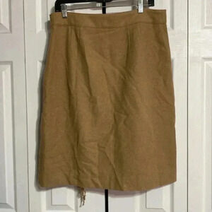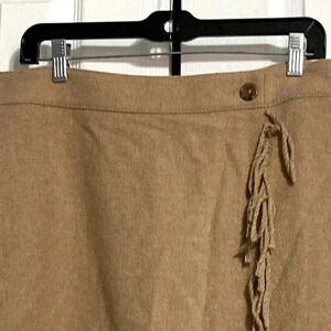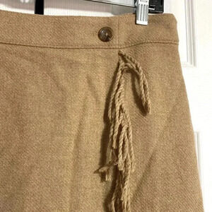 Acrylic polyester wool skirt with fringe front. Lined and with faux button detail front with side zipper. I do not dry clean my price reflects that. Approximate Measurements Laying flat: waist 17” - waist to hem 24 1/2”. Preowned good used condition please check all pictures.(MC71924)