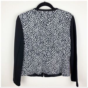 Talbots Women’s Black and White Herringbone Zip Front Jacket with Black Color-block Sleeves Sz 8 EUC. Tiered y cropped style. Stretchy, stylish and work/career ready. Please see photos for additional details. Pit to Pit 19“ Waist 36“ Length 23“ Sleeve 23“
