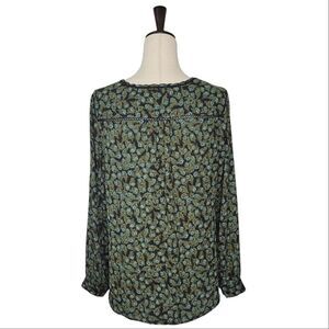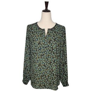 Talbots Black Peacock Feather Print Split Button Neck Long Sleeve Blouse Size M