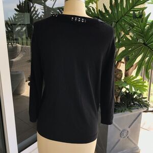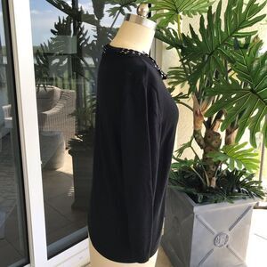 Chic black top with a unique beaded neckline. Perfect for versatile styling.
