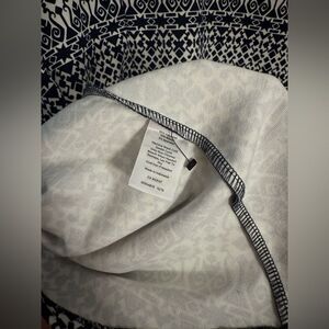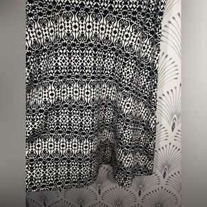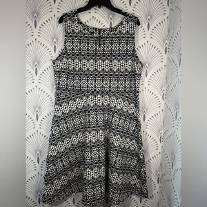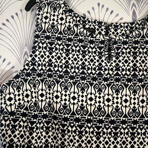 Elegant sleeveless dress. Features intricate black and white pattern. Perfect for any occasion.