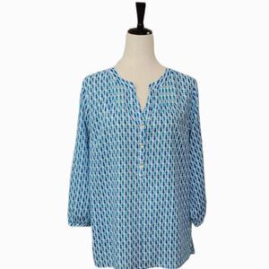 Talbots Blue & Teal Seahorse Print 3/4 Sleeve 1/2 Button Pleated Blouse Size M
