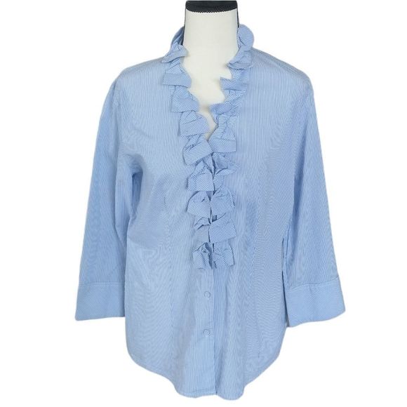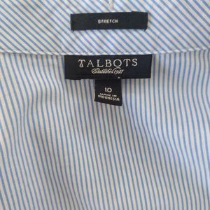 Talbots Ruffle Neck Button Down Shirt. Size 10. 3/4 length sleeve. Blue and white stripe. Excellent condition.