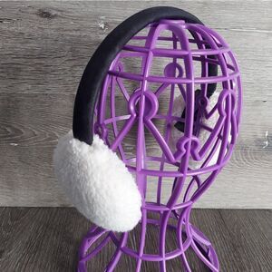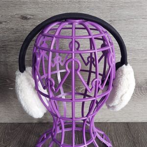 They feature a black headband and white, faux fur ear coverings. Earmuffs like these are designed to keep ears warm in cold weather.