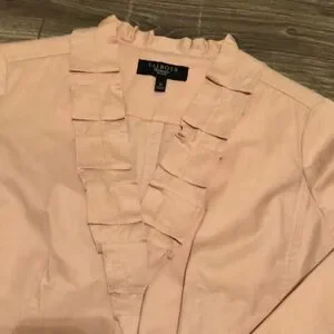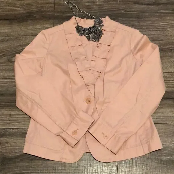 Beautiful light pink jacket from Talbots. Gently used condition. Adorable ruffle detail around neck. 98% cotton and 2% spandex