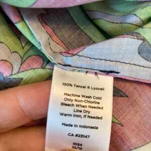 Brighten your look with this Talbots blouse. Features a lively floral pattern. Ideal for any occasion. Reminds me of Pucci that is all over runways. Fabric is so soft. Has one black enameled gold closure or wear unfastened. Side vents. Literally perfect. No flaws or wear. Pit to pit 22” shoulder to hem 25”. Great for almost year round wear.