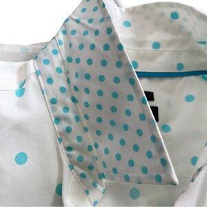 Non-Iron Sleeveless Perfect Shirt in a crisp white with turquoise blue blue polka dots. How can you help not smile and be in a good mood! Inside placket has contrasting fabric of a smaller polka dots.