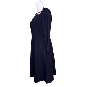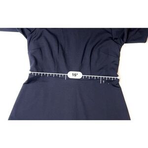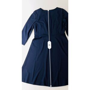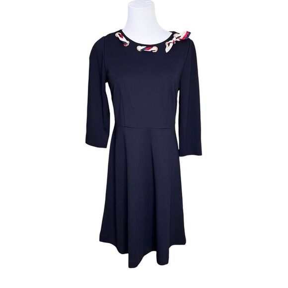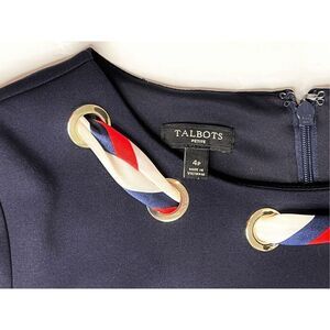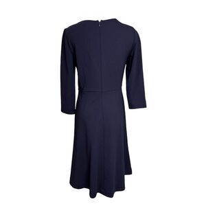 Talbots Petite Retro 50s Scarf Dress 3/4 Sleeve Navy Blue Ponte Fit & Flare 4P. Lovely grommet details with scarf embellishment. Taylor fit construct with flared skirt. Rayon Polyester Spandex blend. Machine washable gentle. Item in excellent gently used condition. No known rips, tears, holes, stains or defects. Reilly's $149