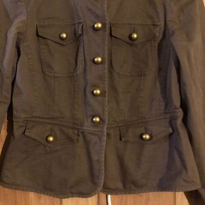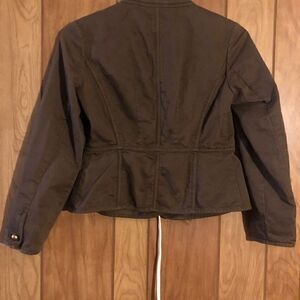 Talbots Petites brown stretch jacket. Size 2 petite. Brown. Buttons half ball shape. Four pockets. Stand up collar. Preowned excellent condition.