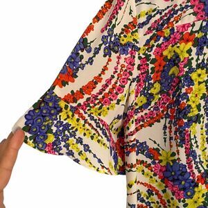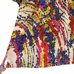 Pretty swirls of colorful little flowers on polyester. Short sleeve with ruffle. Top button with keyhole opening in back- button is a gold flower with a pearl look center. Great. Preowned condition- no flaws- like new.