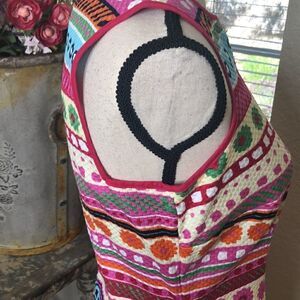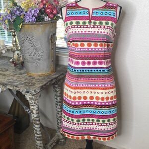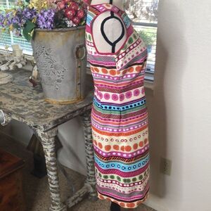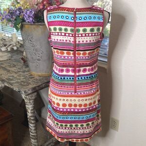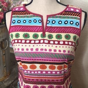 Cute, cute dress in the most fun retro, 70’s vibe print! The fabric is mostly cotton, with a texture that is almost like pique. It is a heavier weight and unlined with pockets, piping around neck and sleeves, and a gold metal exposed zipper. It is sized as a 2, but is actually a bit loose on my mannequin, so please check measurements. It is in perfect condition. Width at bust is 17” seam to seam laying flat. Waist 15”. Hip 18.5”. Length 35.5”.