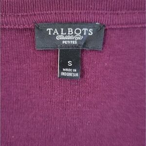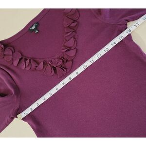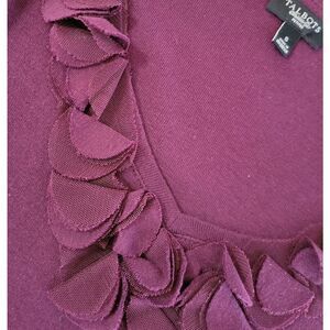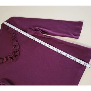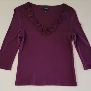 EUC Talbots simple v-neck top is accented with a petal-like ruffle trim at the neck front and has 3/4 length sleeves. Perfect dressed up or with your favourite jeans! Excellent condition in eggplant purple shade.