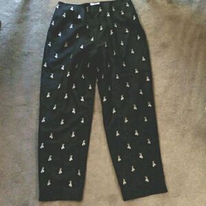 Super cute black pants embroidered with gold tassles ( I have red shoes with the same tassles!) Fully lined. Size zip. Size 12 measures 32 at waist, 48 at hips, 13 inch rise, 29 inch inseam. 16 inch opening at the leg. Classic and pretty.