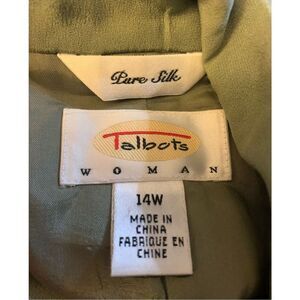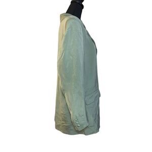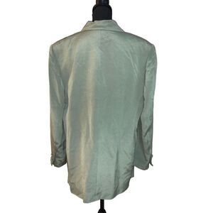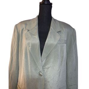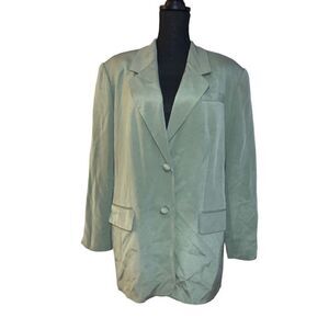Sage green suit jacket. Two button closure. Collared. Shoulder pads. Lining. 100% silk. Lining: 100% acetate. Size: 14W. Preowned in good condition.