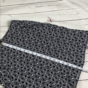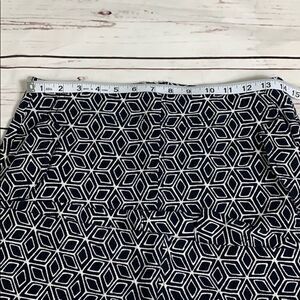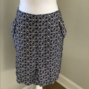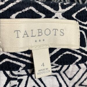 Talbots Pencil Skirt. Navy Blue and white in color. . Zipper in the back. Small slit in front. Two side pockets. Length of the skirt is approximately 19 inches and the waistband is 14 inches. Size 4