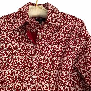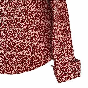Beautiful scrollwork pattern in cranberry red and white. Cotton and elastane has a little stretch. Long sleeve. Great preowned condition- no flaws- does not appear to have been worn- like new.
