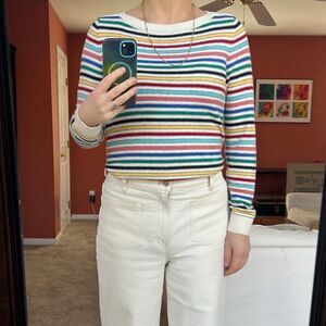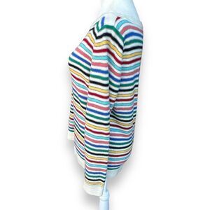 Super soft and comfortable striped sweater by Talbots is a blend of lambswool and nylon. Size medium. Against a cream background, stripes are blue, yellow, red, orange, green and black. Excellent used condition - no flaws detected. See photos for fabric tag and measurements. Approximate pit pit: 18.5”; length: 23.5.”