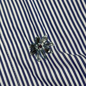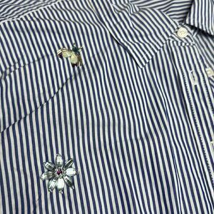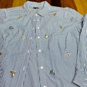 In perfect condition. Never worn all the beading is in perfect condition blue and white pinstripe collared button down long sleeve shirt..