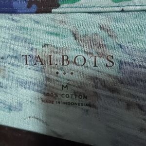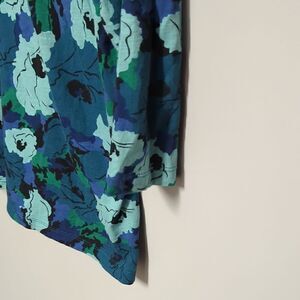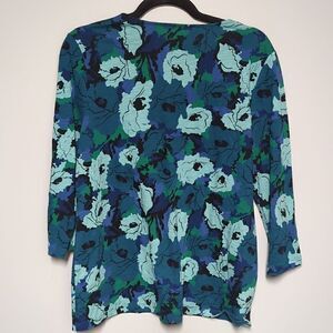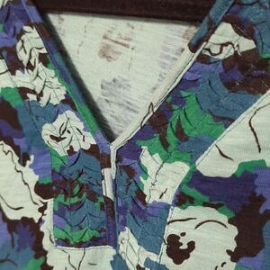 Greens, blues and black floral v neck shirt. Cute details on neckline.