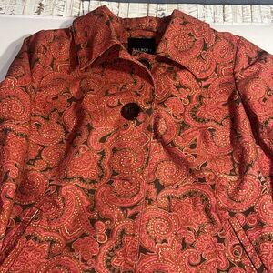 Stylish Talbots jacket with a bold paisley design. Features rust and brown hues. Beautiful design would make a great fall coat for layering. Missing last button, top button could be moved down if needed