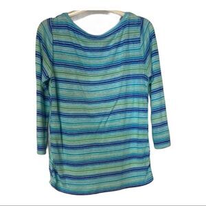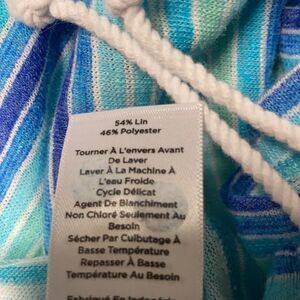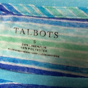 Talbots women’s small top striped 54% linen, 46% polyester. This top is blue and green. Please see approximate measurements and pictures before purchasing. Note how sides can be drawn up or worn down. Please make sure to take advantage of bundles, to save on shipping and pricing. Purchase three items listed $20 or under and get all three For $25. This saves on your shipping as well. Sorry, I cannot discount items $15 or less, unless bundled.