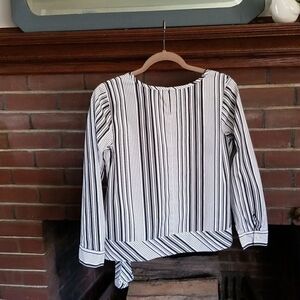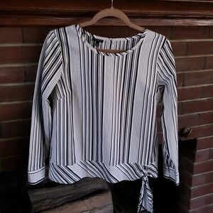 Shoulder to shoulder is 15 inches, armpit to armpit measures 19.5 inches, sleeves are 22.5 inches and the length is 21.5 inches. The color is a very dark grey/black.One button closure in back, side tie. 79% cotton, 18% nylon, 3% spandex blend. Open to reasonable offers.