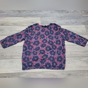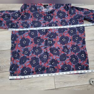 Get ready to turn heads with this Talbots cardigan that's bursting with vibrant style! The dynamic combination of red, blue, and navy blue creates a bold and eye-catching look. The dark blue flowers against the red and light blue background add a playful touch to this fashion-forward piece. Made from a luxurious cotton and rayon blend, this cardigan offers both comfort and elegance. With its 3/4 sleeves and button front, it's the perfect addition to any outfit.