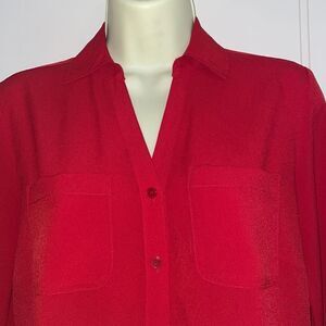 Talbots red polyester long sleeved button down shirt with 2 front pockets & sleeves that can be rolled up & secured with button tab