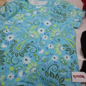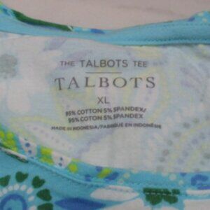 The Tee Shirt by Talbotts, stretchy and comfortable short sleeve floral green and blues and whites pattern. Ladies Xtra Large, see measurements from above. From non smoking home and pet free. Washed and worn a few times.