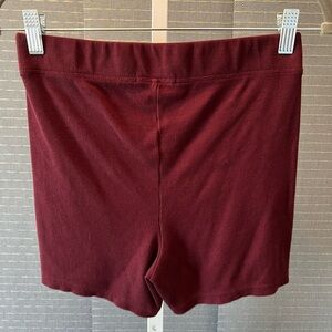 Moderate wear and still in great condition. High rise ribbed shorts in a burgundy color. Rise is 11”, inseam is 3” and waist laying flat is 13-14”. Size is a Medium.