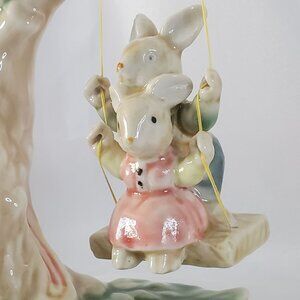 Ceramic Young Bunnies on a Tree Swing