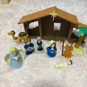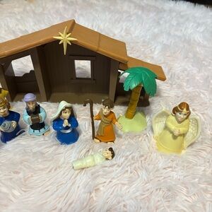 Colorful nativity scene playset featuring various figures and a stable. Includes a camel, palm tree, and angel figures.