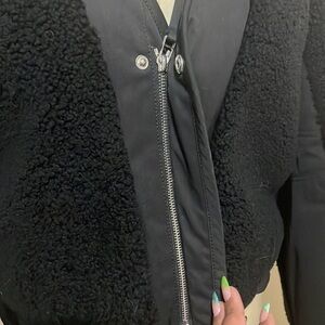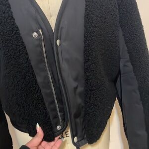 Plush shearling in a BLACK adds a bold texture to this twill T by Alexander Wang jacket. Snaps cover the zip placket. Long sleeves. Side pockets. Satin lining.