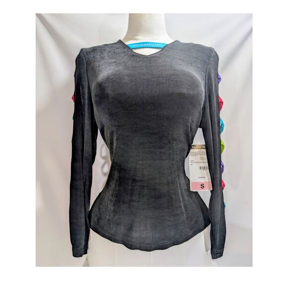 New with tags Talk of the Walk women’s long sleeve top in black with multicolor cutout sleeve accents. Fitted stretch style with a flattering silhouette. Soft acetate-spandex blend with a smooth finish.