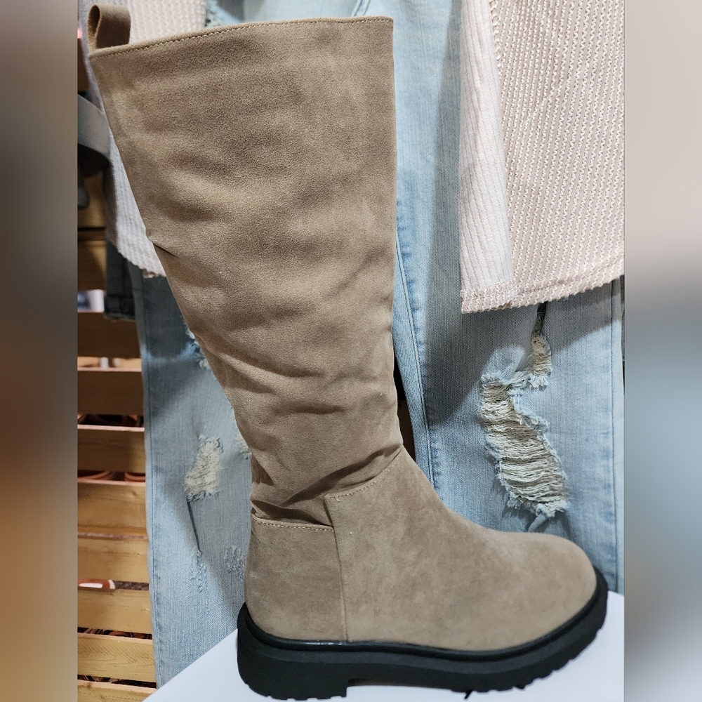 Sand colored faux suede tall boot with side zipper and good tred sole.