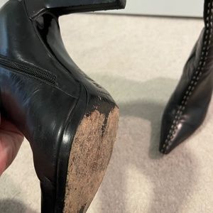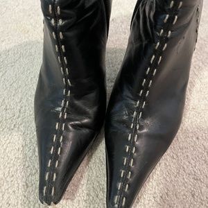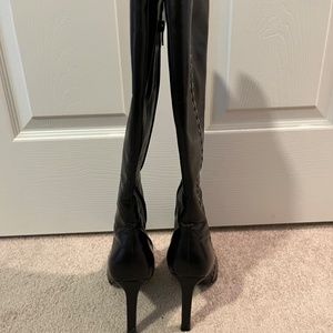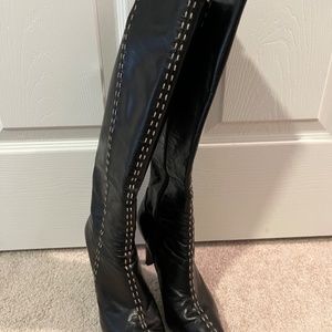 Beautiful and trendy black leather knee boots with tan stitching along the front and the side. Size 7
