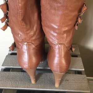 Super Cute tall brown heeled boots with buckles and straps. A few small scuffs on the back heel, otherwise in great condition!
