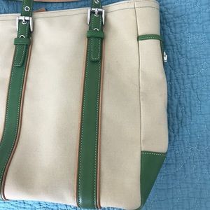 Tall Coach purse with forest green accent leather and tan canvas overall. Lightly used, a couple small scuff marks, see photos.