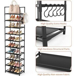 🧿【Large Capacity 10 Tier Narrow Shoe Rack】The 10 tier shoe organizer can store up to 20-25 pairs of adult shoes, and you can remove one layer to fit long boots. This shoe organizer is not only suitable for shoes, but also for bags, toys, towels, sundries, books, plants and small accessories. Shoe storage with 5 hooks, you can hang keys, umbrellas, bags, etc., very practical design.