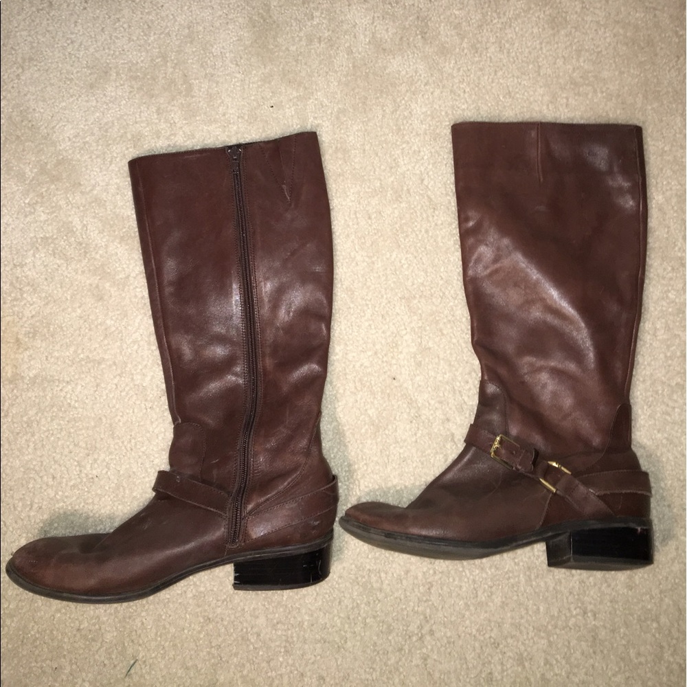 Brown Riding Boot. Good condition of leather. Paint of the heel has scratches on the back (last picture). Shoe is tight on calf! Goes almost to bottom of the knee on me (height 5'6")