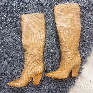 Leather Carmel color Tory Burch knee boots. Looks like eel skin but all leather size 9. Maybe worn once - excellent condition. See pictures for one small scuff above the heel of one boot and on toe of one boot but nothing serious and a quick shoe polish will do the trick. No large Tory Burch logo anywhere and gold accent metal at toes. 3.5” heel 17” shaft
