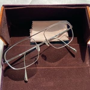 Pair of "Daytona" aviator eyeglasses by Talla Eyewear in the color silver. Talla Eyewear is the sister brand to the high end designer eyewear brand Caroline Abram Paris. Originally retailed for $390. Made of titanium. In excellent LIKE NEW condition. Could easily be re-lensed with your unique Rx or made into chic sunglasses!