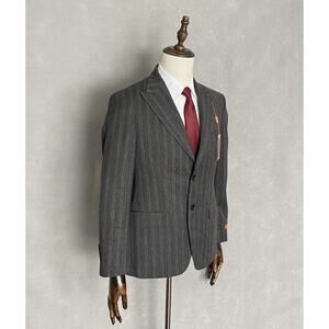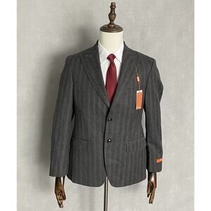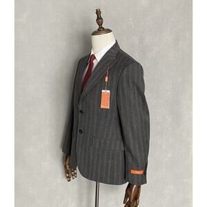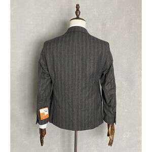 This listing is for a new with tags Tallia Men's 38 Short Suit Jacket in a Charcoal & Brown Striped Pattern. Fully Lined, Two Button Closure, Two Front Flap Pockets, Welt Pocket at Chest, Peak Lapel, Side Vents, 4-Button Cuff. 70% Wool, 30% Polyester, Dry Clean Only.